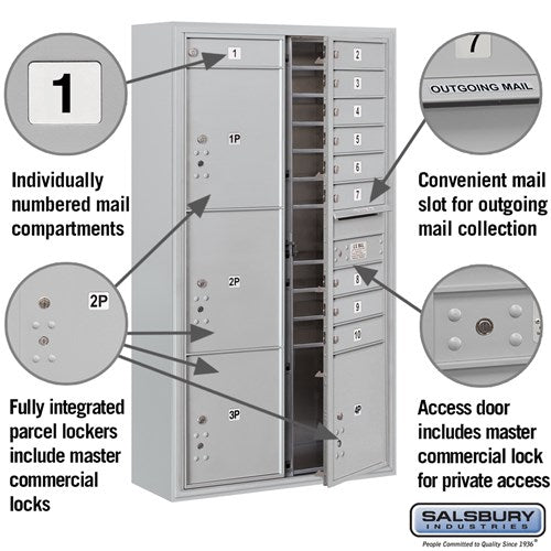 Maximum Height Surface Mounted 4C Horizontal Mailbox with 10 Doors and 4 Parcel Lockers in Aluminum with Private Access