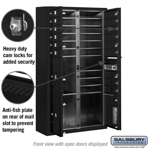 Maximum Height Surface Mounted 4C Horizontal Mailbox with 15 Doors and 3 Parcel Lockers in Black with USPS Access