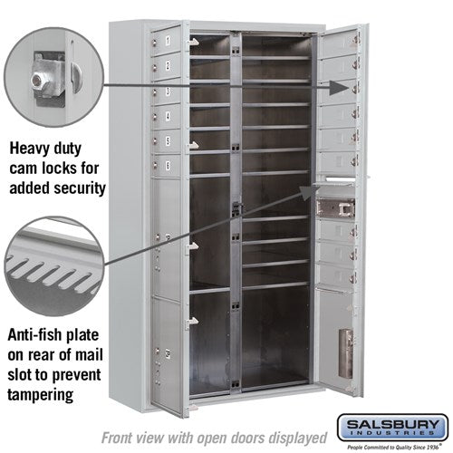 This surface-mounted 4C horizontal mailbox offers secure mail storage with 15 compartments and 3 parcel lockers, designed for indoor or outdoor use. Constructed from heavy-duty aluminum, it features a durable powder-coated finish and complies with ADA height standards.