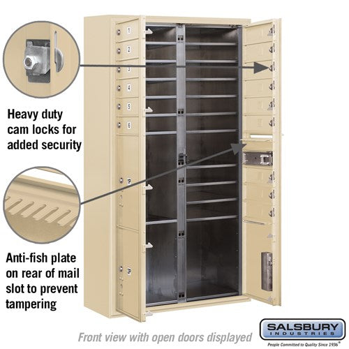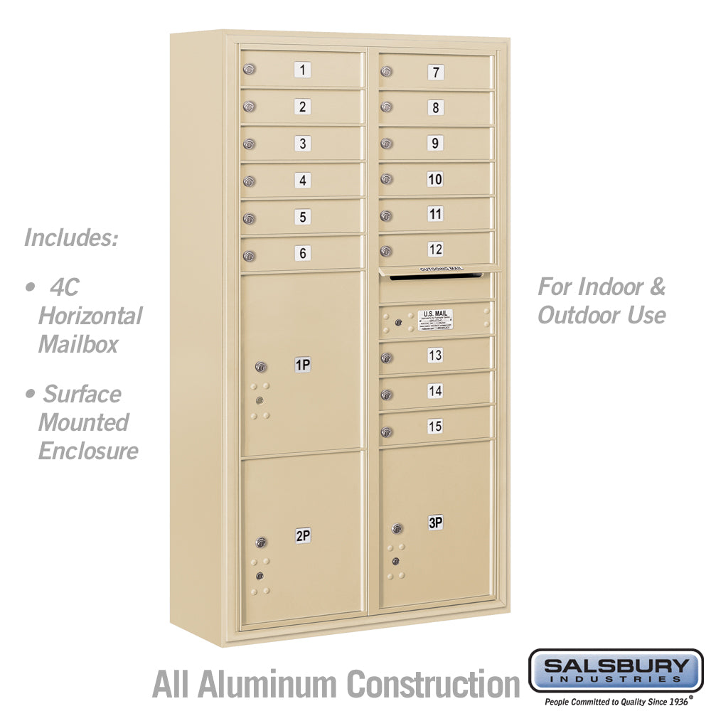 This surface-mounted 4C horizontal mailbox unit offers maximum height with 15 mail compartments and 3 parcel lockers, designed for USPS access. Constructed from heavy-duty aluminum with a sandstone powder-coated finish, it is ideal for indoor or outdoor use.