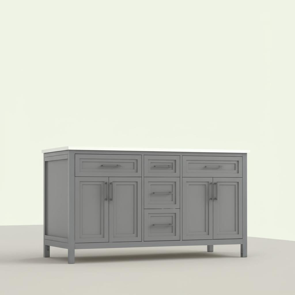 The Mayfield 60-inch double vanity is a masterpiece of transitional design, blending functionality with refined aesthetics. Its American Gray lacquered finish and brushed nickel hardware create a sophisticated yet approachable look, perfect for modern and classic interiors alike. The white engineered stone countertop and undermount sinks add a touch of luxury, while the ample storage ensures practicality. Pair it with soft lighting and textured accessories to create a serene and stylish bathroom retreat.