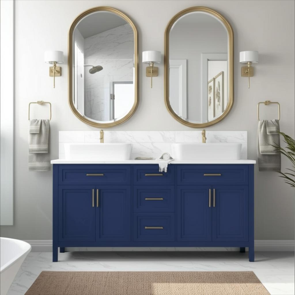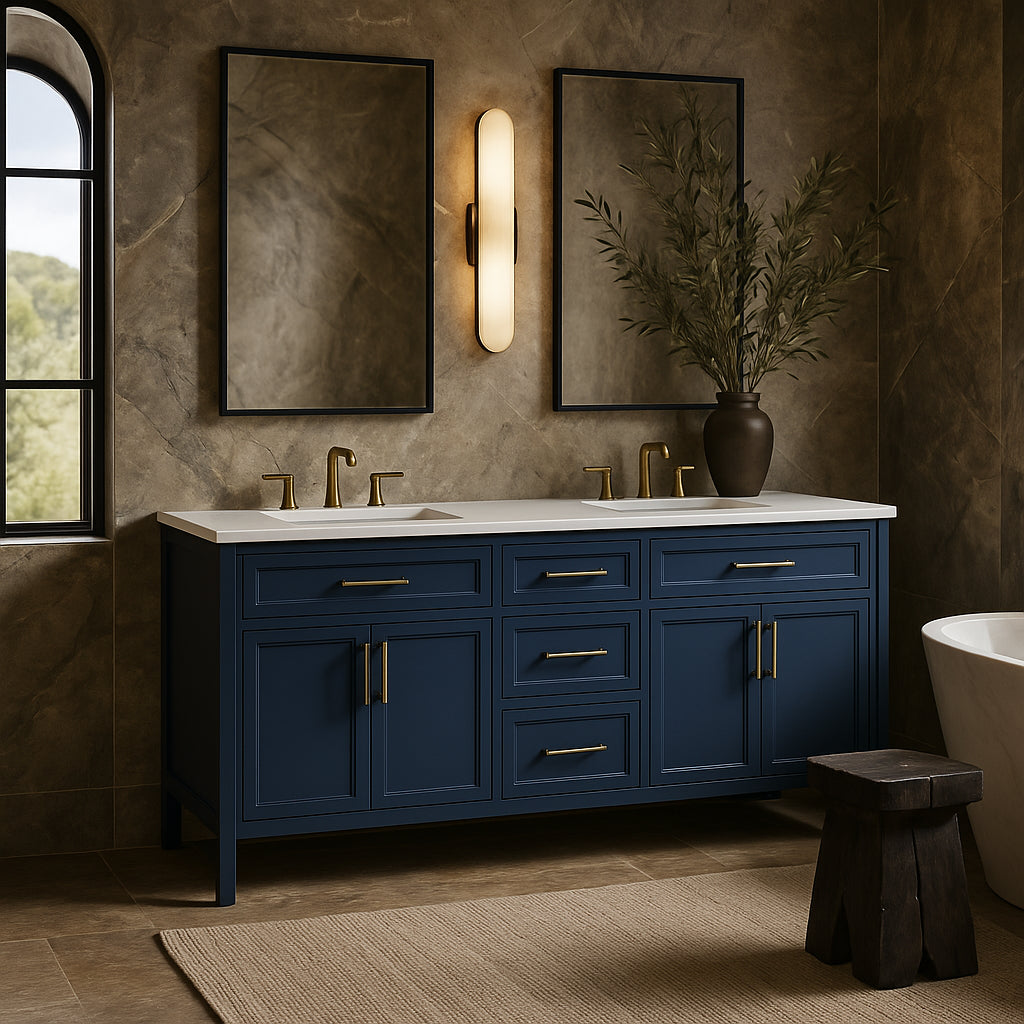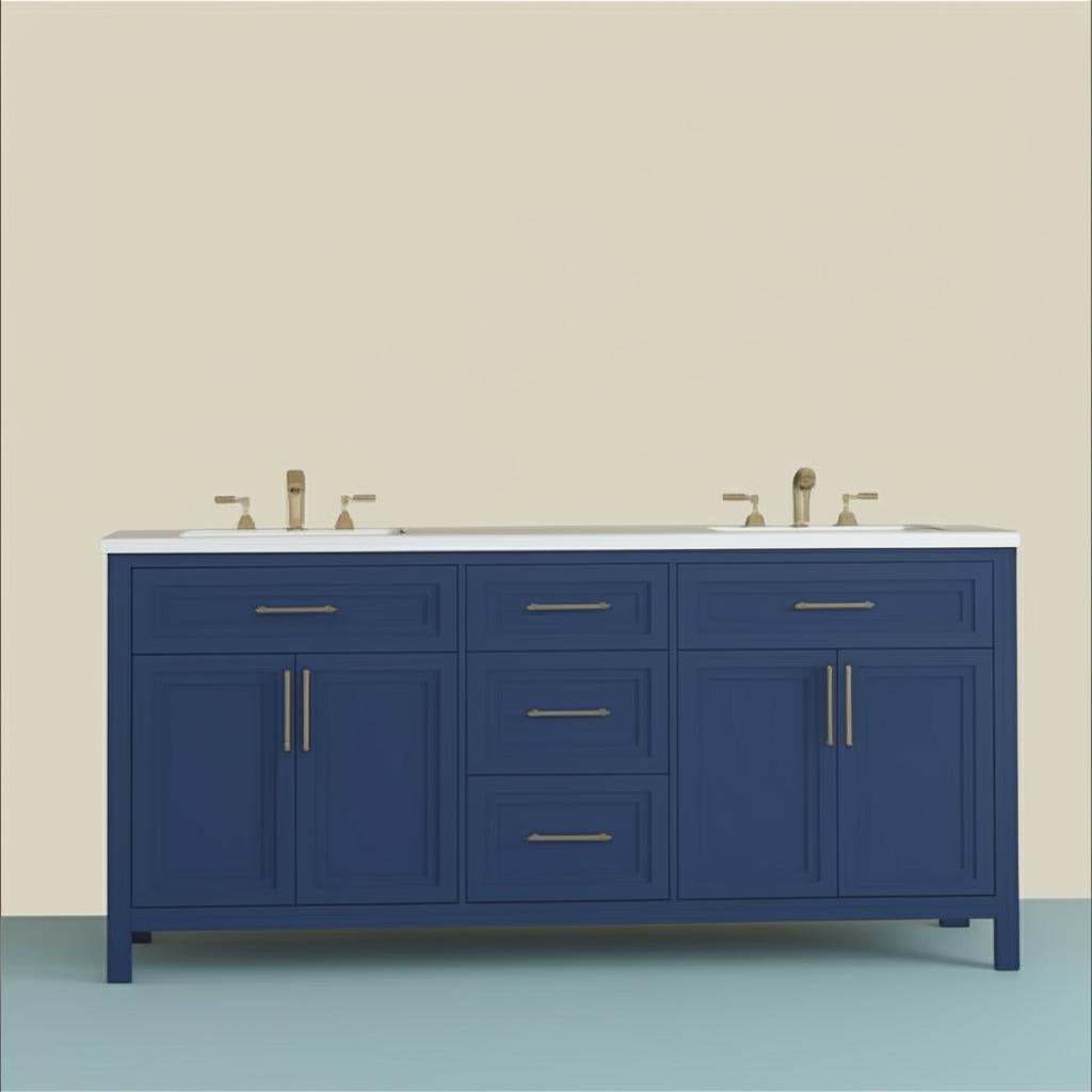 The Mayfield 72-inch double vanity is a masterpiece of transitional design, blending functionality with refined aesthetics. Its Grayish Blue lacquered base and brass hardware create a sophisticated palette, while the engineered stone countertop adds a touch of modern luxury. Style it with gold accents and plush towels to elevate your bathroom into a serene retreat. This vanity is not just a fixture; it's a statement of elegance and practicality.
