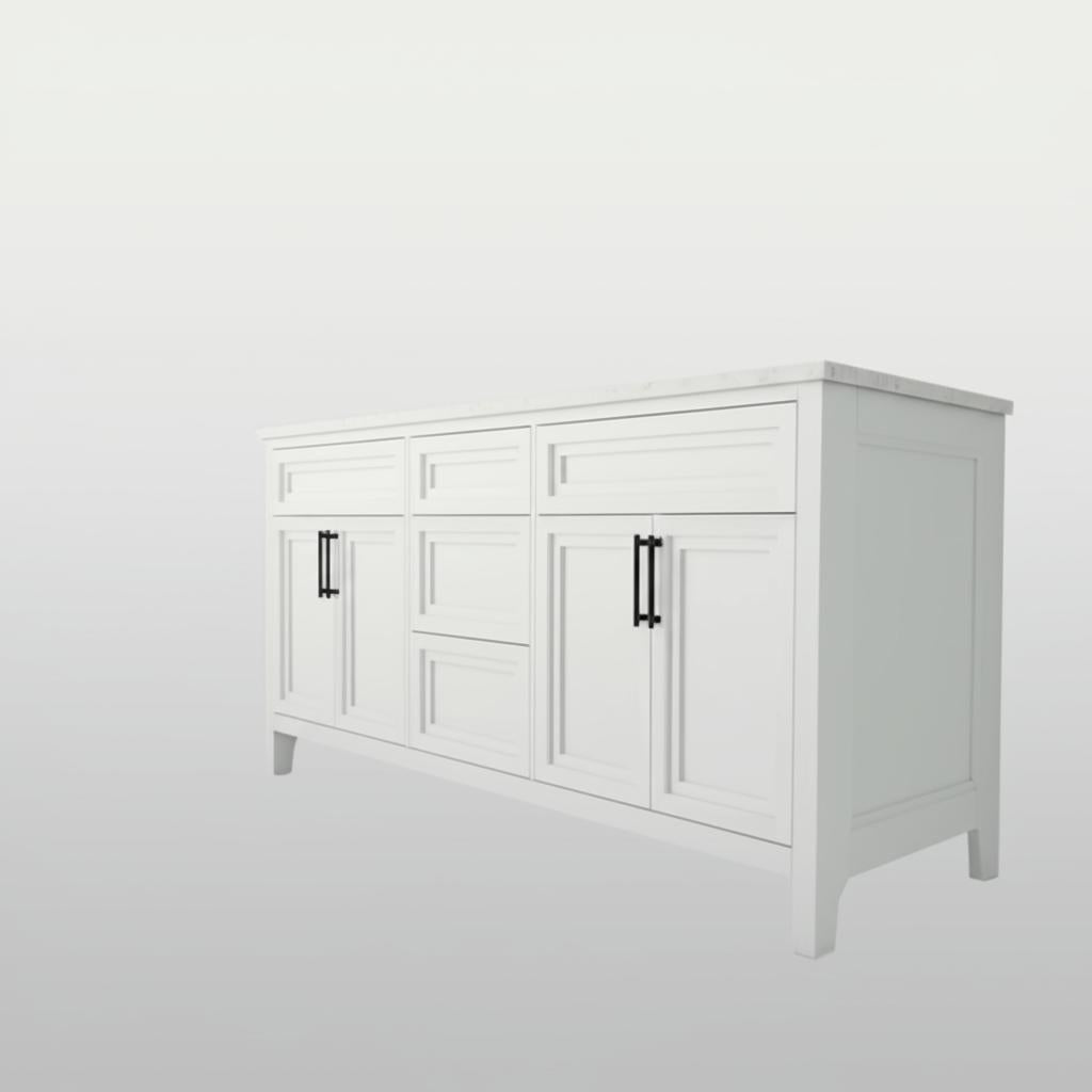The Mayfield 72-inch double vanity is a masterpiece of transitional design, blending functionality with refined aesthetics. Its pristine white engineered stone countertop and sleek black hardware create a striking contrast, while the ample storage ensures practicality. Style it with modern faucets and a pair of elegant mirrors to complete the look. This vanity is not just a fixture; it's a statement of sophistication and luxury.
