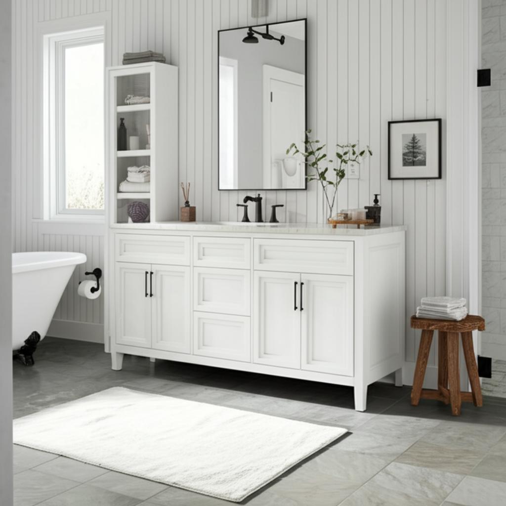 The Mayfield 72-inch double vanity combines transitional style with practical functionality. Featuring a white engineered stone countertop, black hardware, and ample storage, this freestanding vanity is perfect for modern bathrooms.