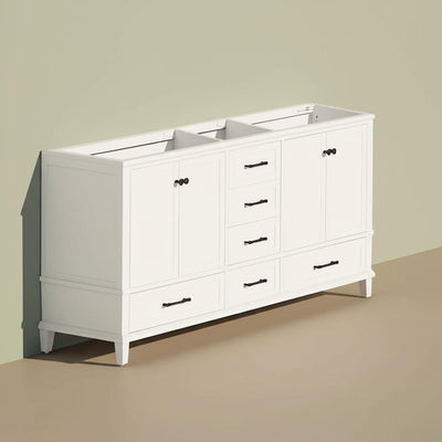 The Merryfield Vanity Cabinet combines durable construction with elegant design, featuring soft close drawers and doors, adjustable levelers, and a crisp white finish. Perfect for customizing with your choice of vanity top and fixtures.