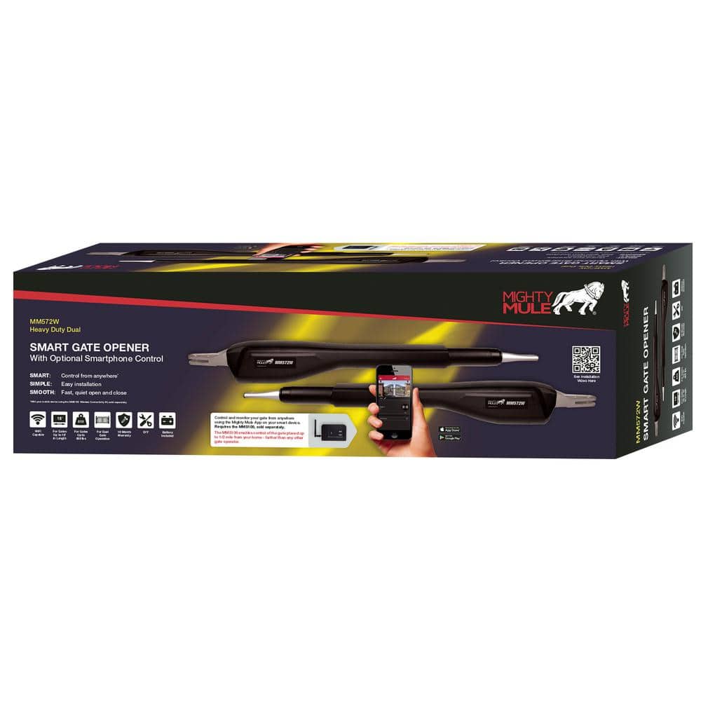 The Mighty Mule MM572W is a heavy-duty, dual swing gate opener designed to handle gates up to 18 ft long and 850 lbs. It offers unparalleled convenience with optional smart device connectivity and solar capability for flexible power solutions, making it ideal for residential use.