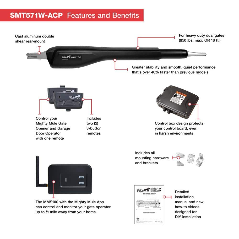 Effortlessly secure your property with the Mighty Mule Heavy Duty Smart Gate Opener Kit, designed for superior control from your smartphone. Ideal for single swing gates up to 18 feet or 850 pounds, it offers versatile connectivity, including optional solar power, empowering both pros and DIY enthusiasts with easy installation and exceptional convenience.