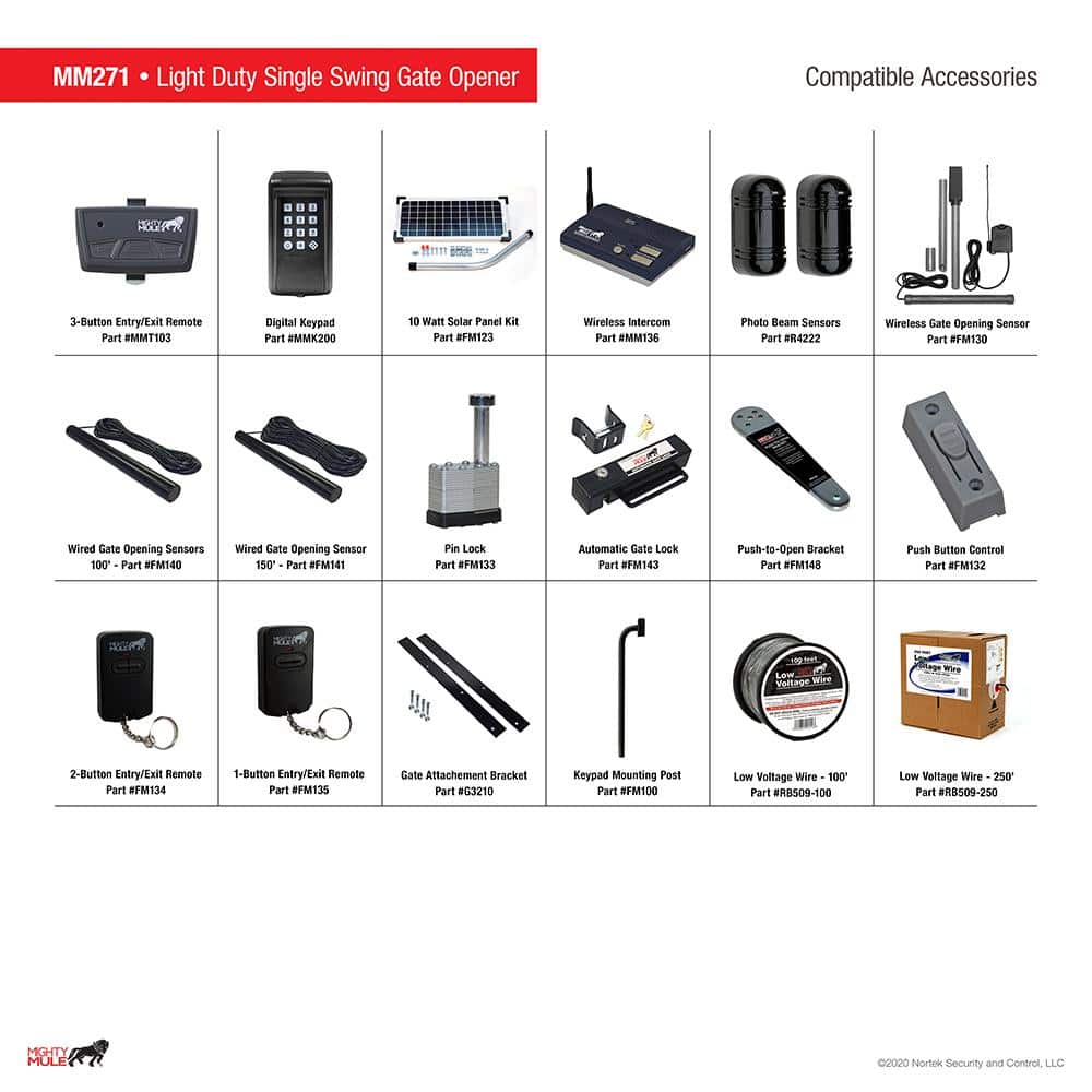 The Mighty Mule MM271 is a robust automatic gate opener designed for light duty single swing gates up to 12 feet long or 300 lbs. With solar compatibility and ease of installation, it's perfect for DIY enthusiasts who value convenience and security. Enjoy round-the-clock technical support to ensure a successful setup.