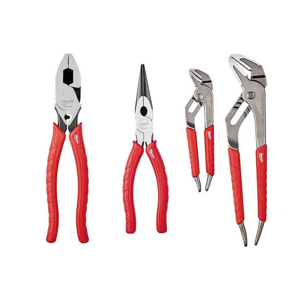 This 4-piece Milwaukee set combines high-leverage cutting and gripping power for electrical and general jobsite tasks. Includes lineman’s pliers with on-board crimper, long nose pliers, and 6 in./10 in. straight-jaw pliers, all with comfort grips and rust protection for long life.