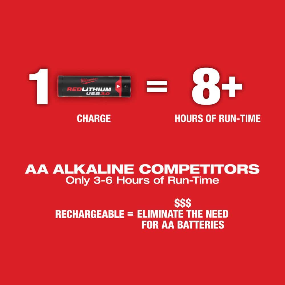 Q: What is the runtime? A: Over 8 hours per charge with the REDLITHIUM USB battery, rechargeable in-tool via Micro USB.