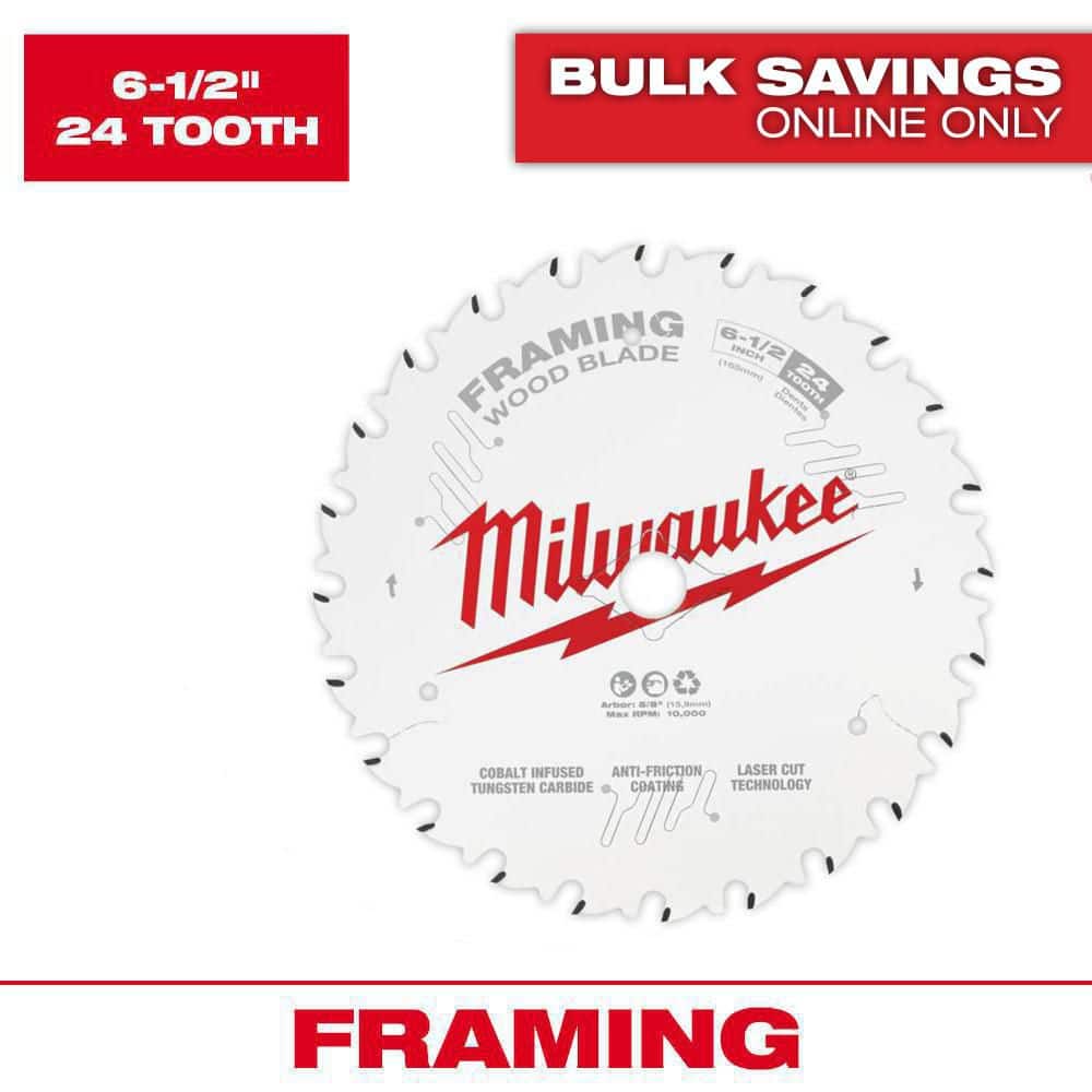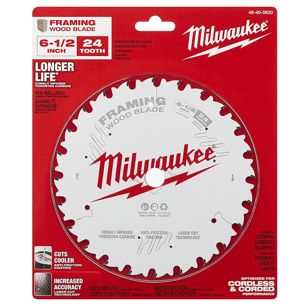 Milwaukee’s 6-1/2 in. 24-tooth carbide framing blades deliver fast, clean cuts and long life for wood applications. Laser-cut steel with vibration slots improves accuracy, while an anti-friction coating keeps the blade cool and resists gumming—ideal for maximizing cordless tool run time.