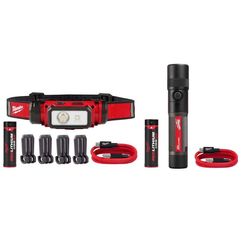 This Milwaukee two-piece lighting kit pairs a 600-lumen REDLITHIUM USB hard hat headlamp with an 1100-lumen USB rechargeable twist focus flashlight. Built for job sites, both lights offer durable, water- and impact-resistant construction with fast USB charging and swappable REDLITHIUM USB 3.0 batteries for extended runtime.