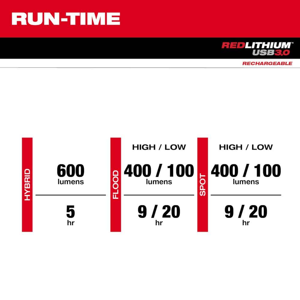 | Items Included | (1) 600 Lumen Headlamp; (1) 500 Lumen Pivoting USB Flashlight; (1) REDLITHIUM USB 3.0Ah Battery; (1) USB-C Cable; (4) Hard Hat Clips |