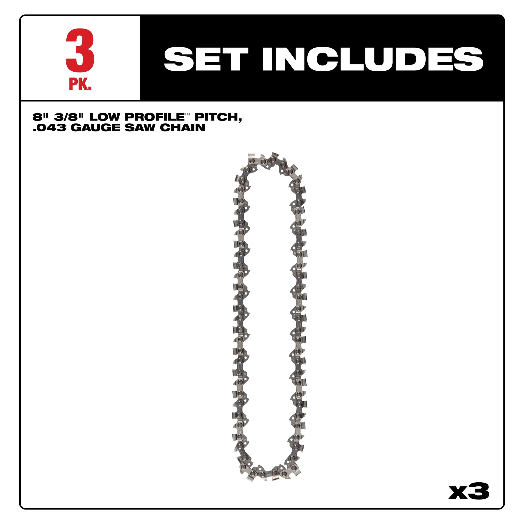 This 8 in. chainsaw chain 3-pack delivers smooth pruning with controlled, low-vibration cuts. The narrow-kerf, 3/8 in. Low Profile pitch and .043 in. gauge maximize efficiency and battery runtime, ideal for the M18 FUEL HATCHET 8" Pruning Saw.
