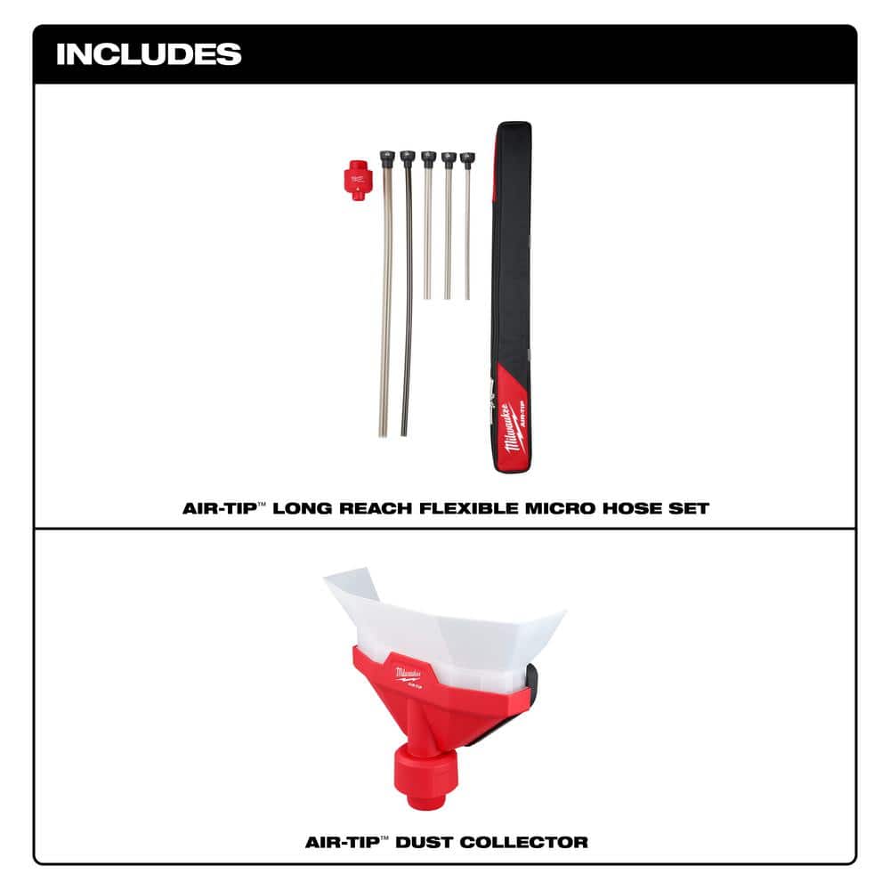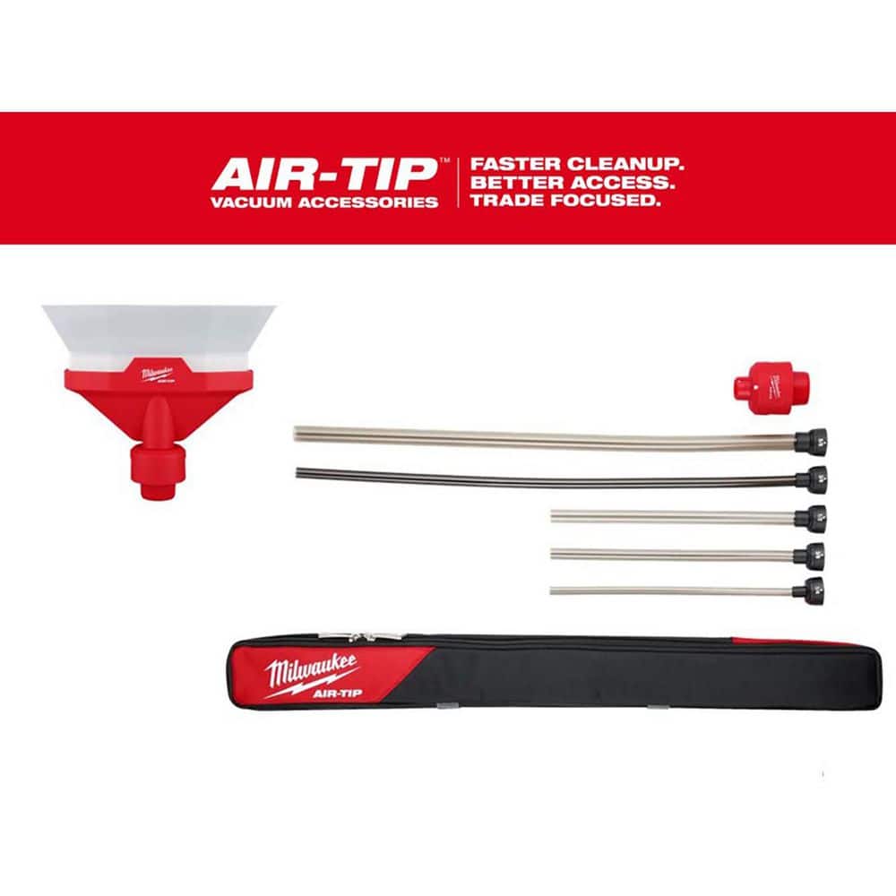 Capture debris at the source with Milwaukee’s AIR-TIP Dust Collector paired with a long-reach flexible micro hose set. The funnel design with a rubber seal maintains suction to walls for hands‑free use, while five interchangeable micro hoses reach tight spaces and fit common wet/dry vacuum sizes.