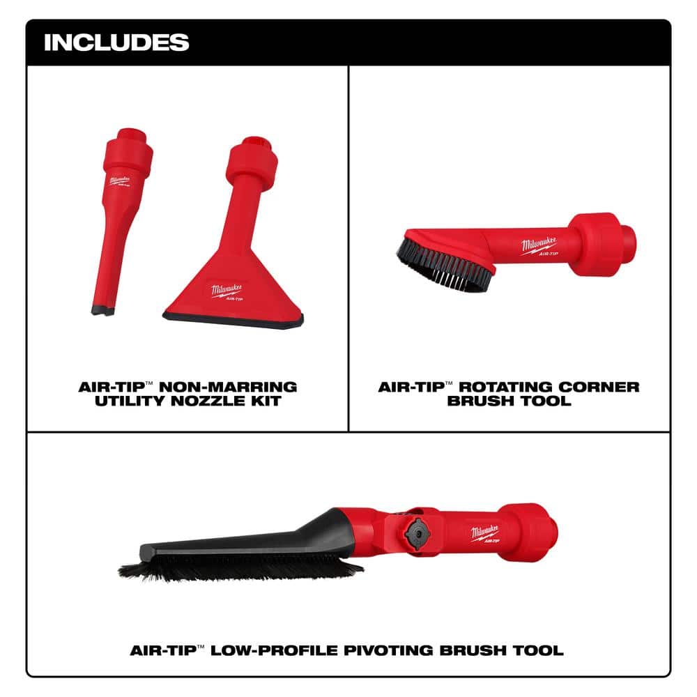 This 3-piece Milwaukee AIR-TIP kit delivers scratch-free cleanup on finished surfaces. The non-marring crevice tool, utility nozzle, and brush attachments feature specialized resin edges and are compatible with 1-1/4 in., 1-7/8 in., and 2-1/2 in. wet/dry vacuum hoses for pro-grade results.