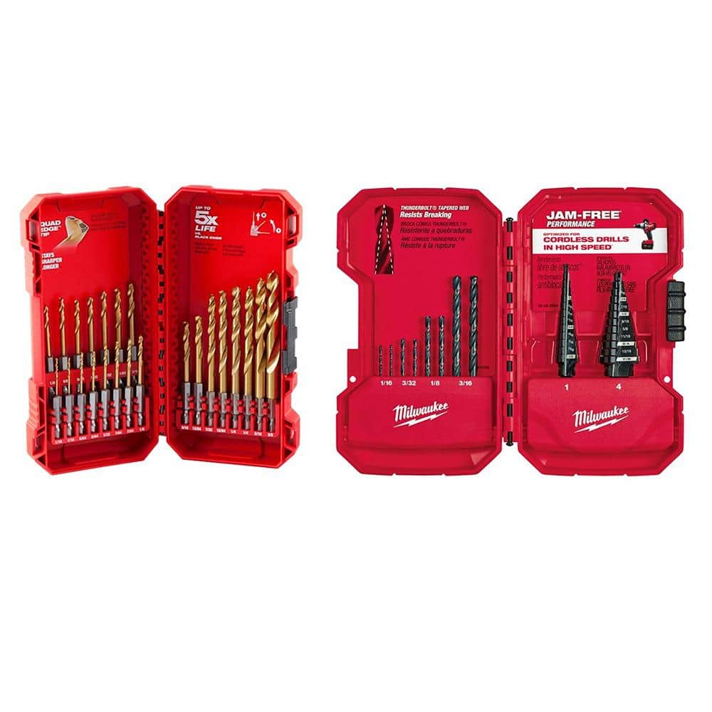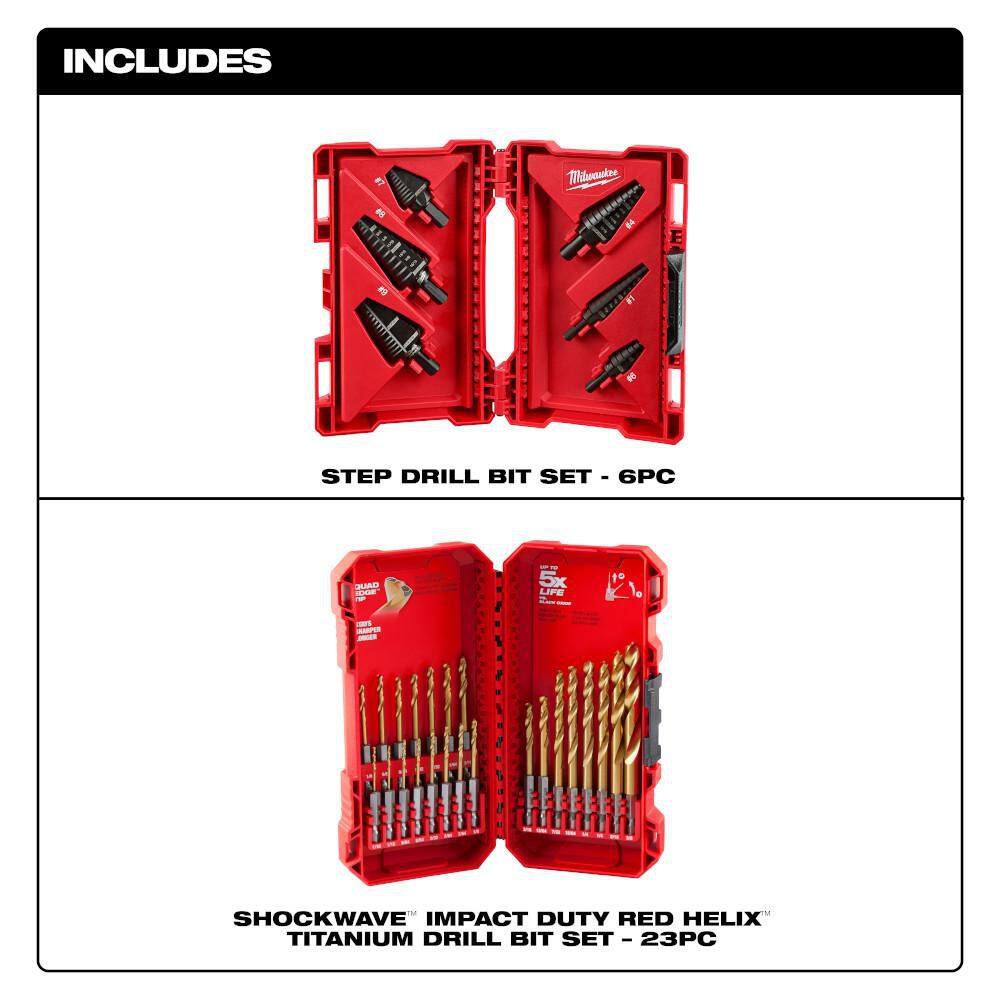 A 26-piece combination set featuring Milwaukee Black Oxide Step Bits and SHOCKWAVE Impact Duty RED HELIX Titanium twist bits. Optimized for cordless drills and impact drivers, the set delivers faster drilling, longer life, and clean holes in wood, plastics, and metals.