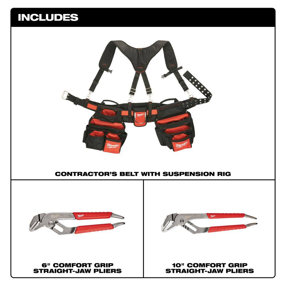 Milwaukee Contractor’s Work Belt with Suspension Rig + 6 in. & 10 in. Straight‑Jaw Pliers Set (2‑Piece)