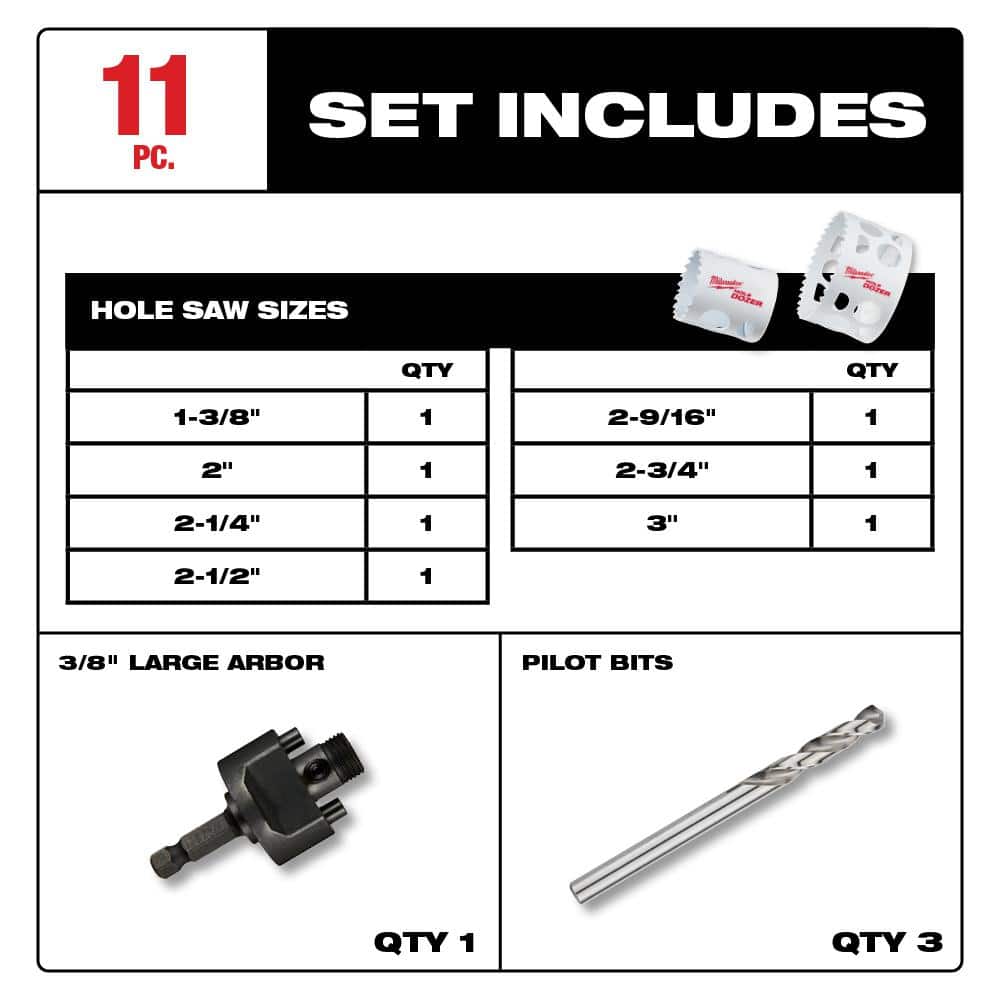 A: Hole saws: 1-3/8 in., 2 in., 2-1/4 in., 2-1/2 in., 2-9/16 in., 2-3/4 in., 3 in.; includes large thread arbor and 3 pilot bits. Selfeed bits: 1-3/8 in., 1-1/2 in., 2-1/8 in., 2-9/16 in.; includes 4 replacement blades, Quik-Lok 5-1/2 in. extension, feed/set screws, and hex key.
