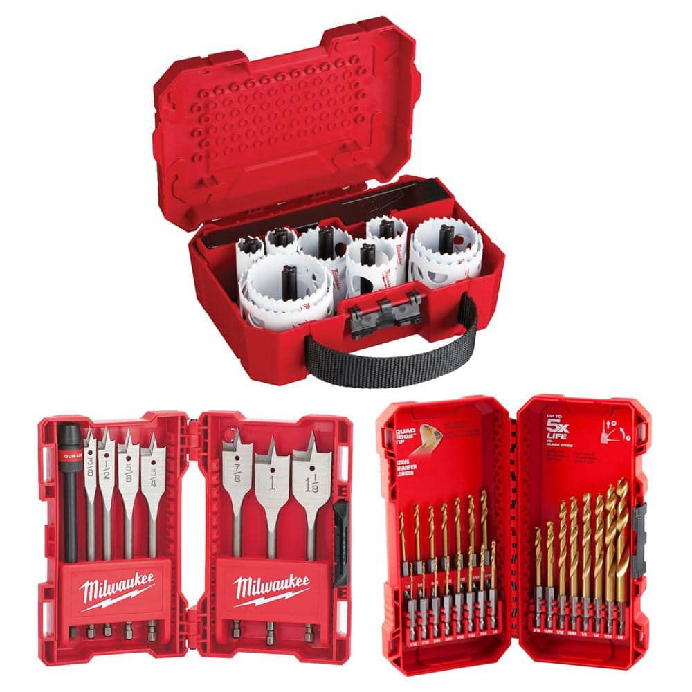 Comprehensive 44-piece Milwaukee set combining HOLE DOZER bi‑metal hole saws, SHOCKWAVE RED HELIX titanium drill bits, and QUIK‑LOK flat boring bits for multi‑material drilling. Built for longevity and cordless efficiency, with lifetime tooth break warranty and fast plug removal.