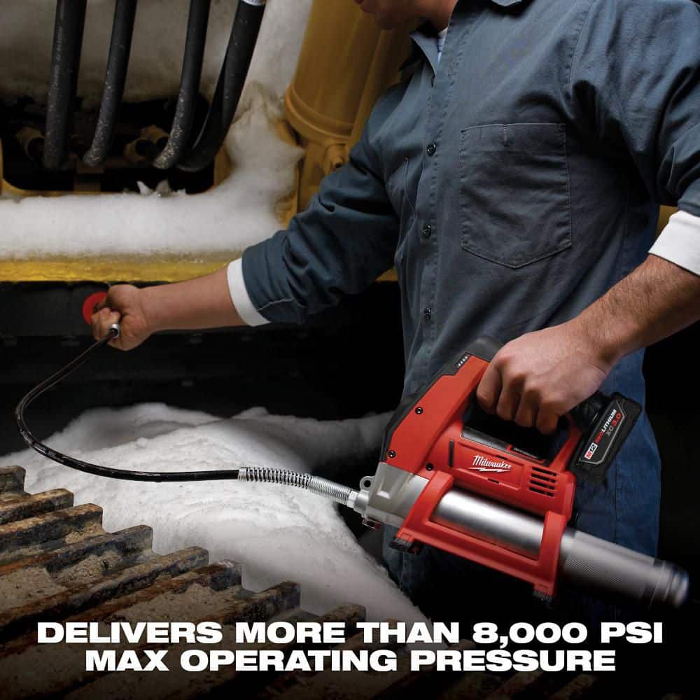 This Milwaukee M12 cordless grease gun kit delivers over 8,000 PSI for fast, dependable lubrication in tough conditions. Powered by an M12 REDLITHIUM XC4.0 battery, it offers long run time, variable speed control, and ergonomic handling with onboard hose storage and fuel gauge.