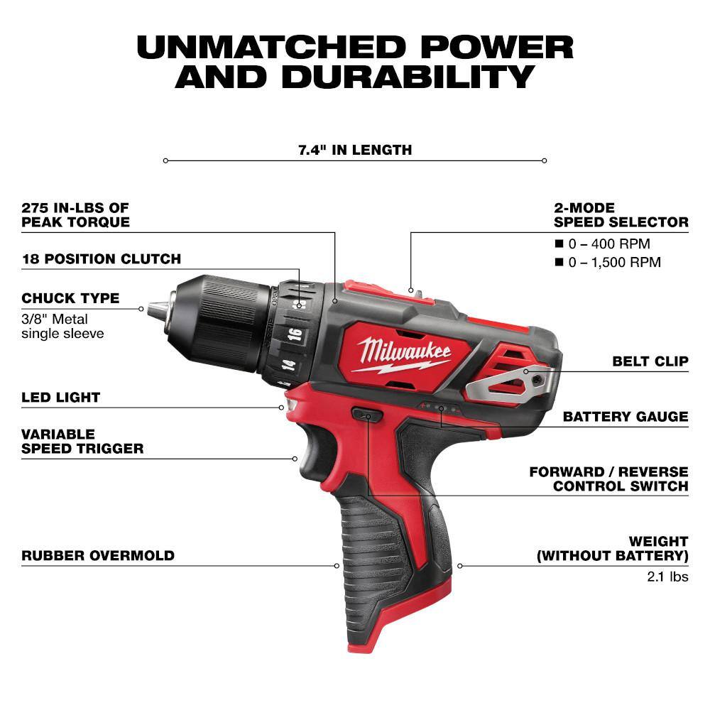 Q: How do I charge the batteries? A: Use the included M12 charger to recharge the REDLITHIUM batteries efficiently.