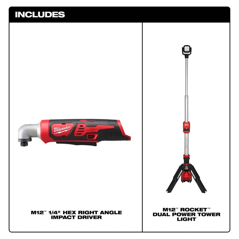 Milwaukee M12 12V Lithium-Ion Cordless 1/4 in. Right Angle Hex Impact Driver with M12 1400-Lumen ROCKET LED Stand Work Light, Tool-Only