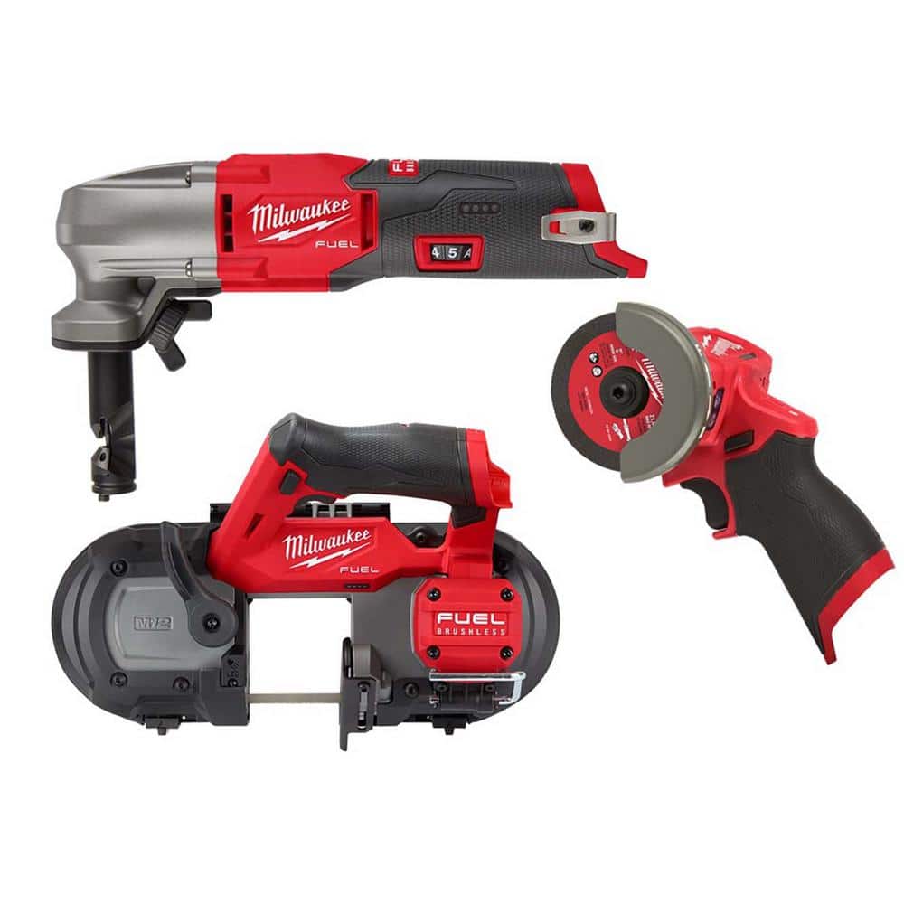 A compact, cordless 12V cutting kit powered by Milwaukee’s POWERSTATE brushless motors. Includes a 16-gauge variable-speed nibbler, compact band saw, and 3 in. cut-off saw for fast, precise cuts across metal and other materials.