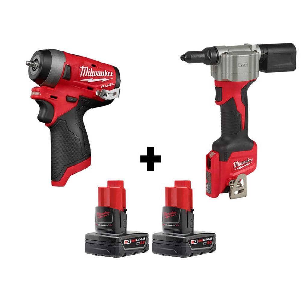 Milwaukee M12 FUEL 12-Volt Lithium-Ion Brushless Cordless Stubby 1/4 in. Impact Wrench and Rivet Tool with Two 3.0 Ah Batteries