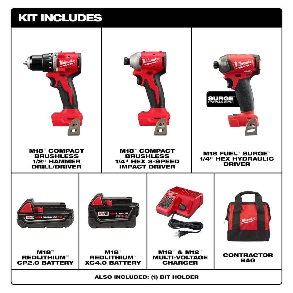 Q: What is included in this combo kit? A: The kit includes a compact brushless hammer drill, a compact brushless impact driver, two REDLITHIUM batteries (XC4.0 and CP2.0), a multi-voltage charger, and a contractor bag.