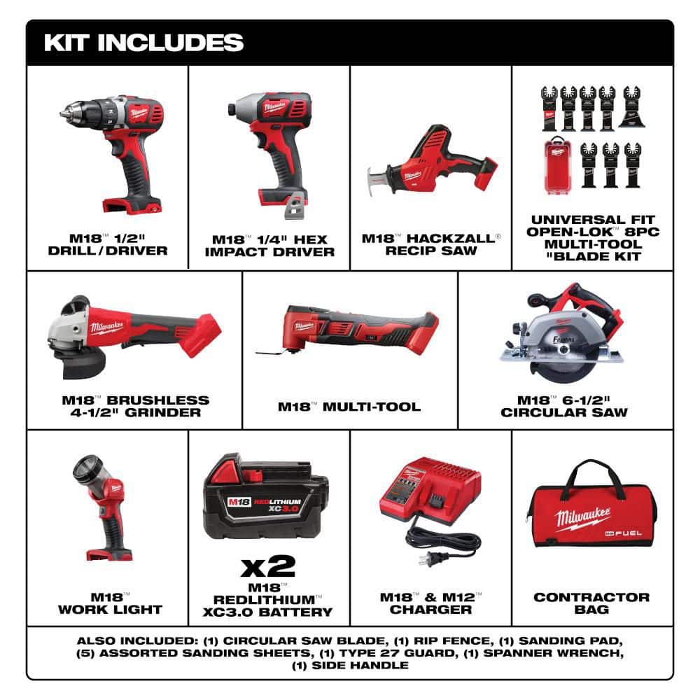 A professional-grade M18 cordless combo kit featuring seven essential tools powered by two REDLITHIUM XC3.0 batteries. Includes drill/driver, impact driver, circular saw, Hackzall recip saw, brushless grinder, multi-tool, and LED work light plus an M18/M12 charger and contractor bag. Built for portability, durability, and high performance across wood, metal, and PVC tasks.