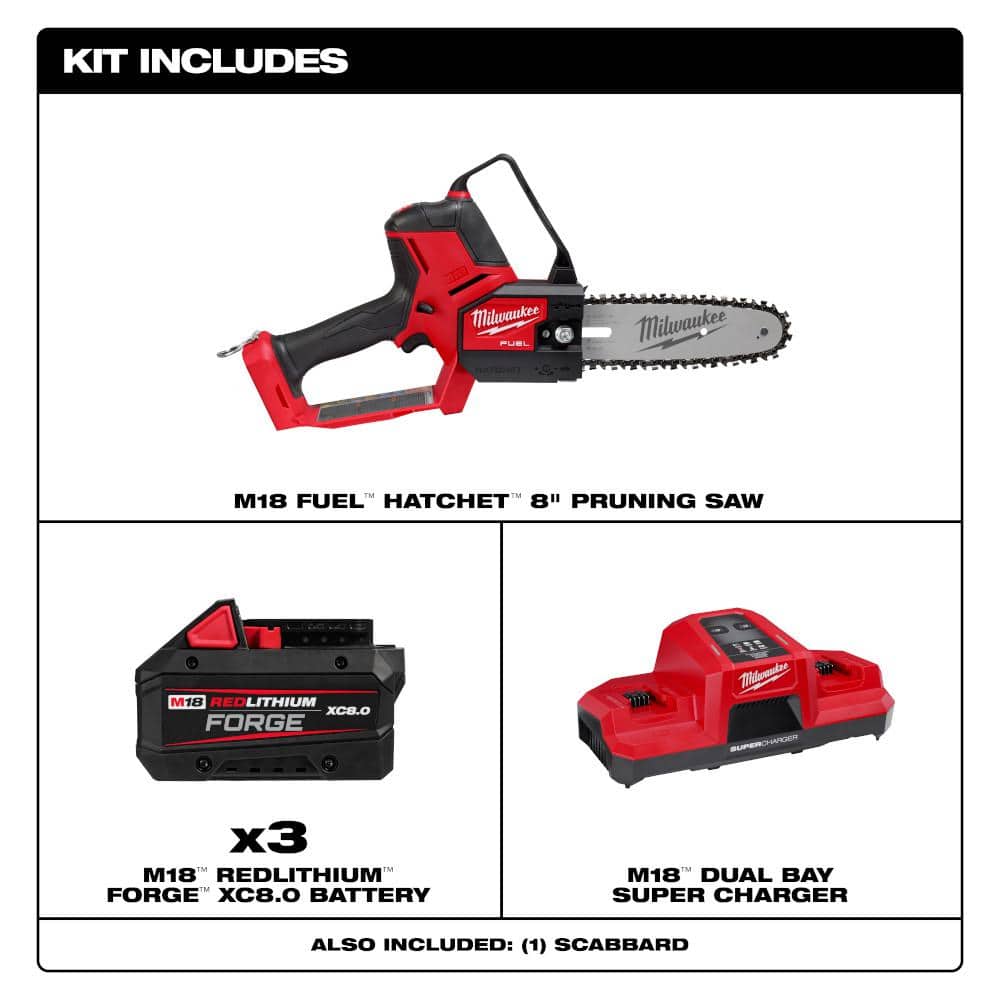Complete Kit: Includes M18 HATCHET saw, three FORGE XC 8.0Ah batteries, dual bay simultaneous super charger, scabbard, chain, and scrench