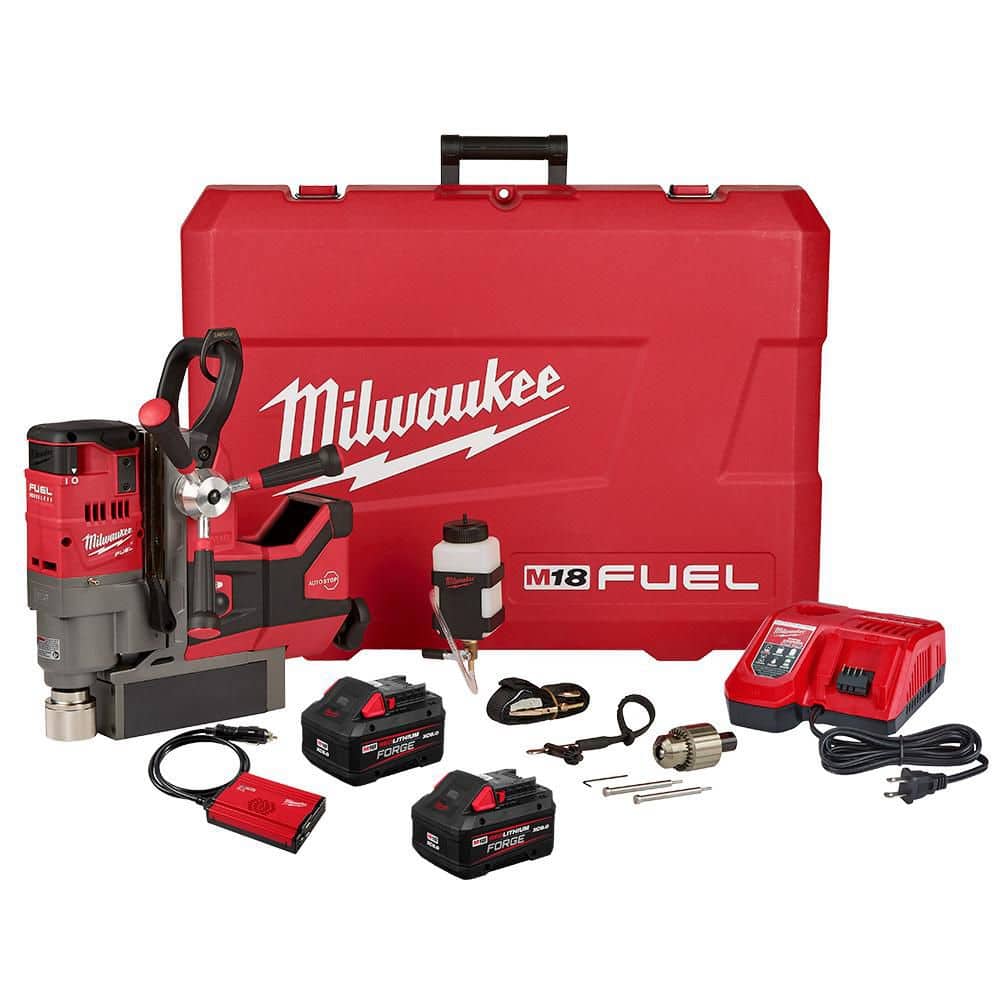 A: Drill, two M18 REDLITHIUM FORGE XC8.0 batteries, M18/M12 rapid charger, 12V inverter, lubrication tank, 3/4 in. Weldon to 1/2 in. chuck adapter, chuck key, two 1 in. retractable pilot pins, safety strap, and carrying case.