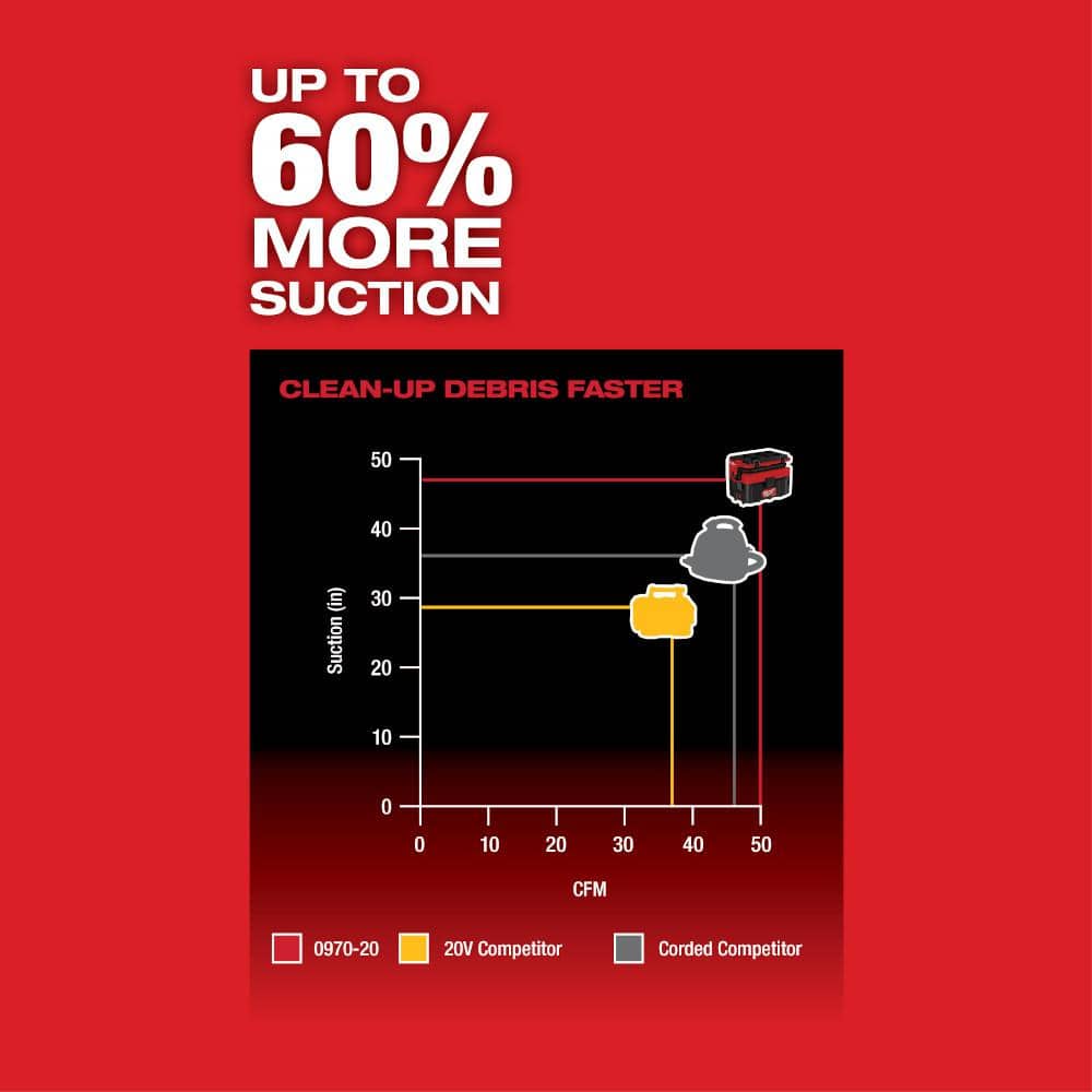 Jobsite Ready: 2.5-gal capacity, 59 CFM airflow, on-board hose/accessory storage and blower port