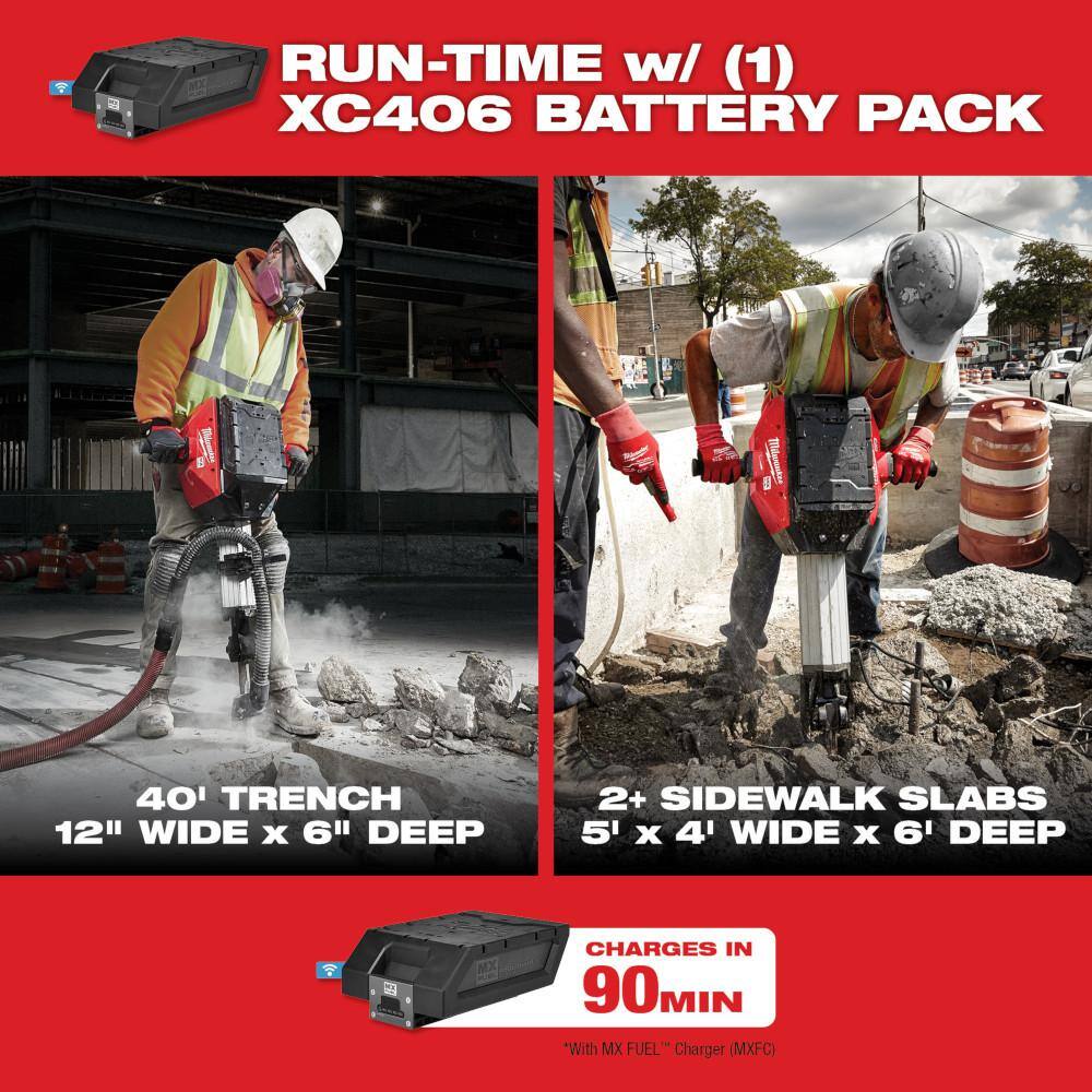 Q: How much can the breaker demolish per charge? A: Over two tons per charge with the MX FUEL REDLITHIUM XC battery.