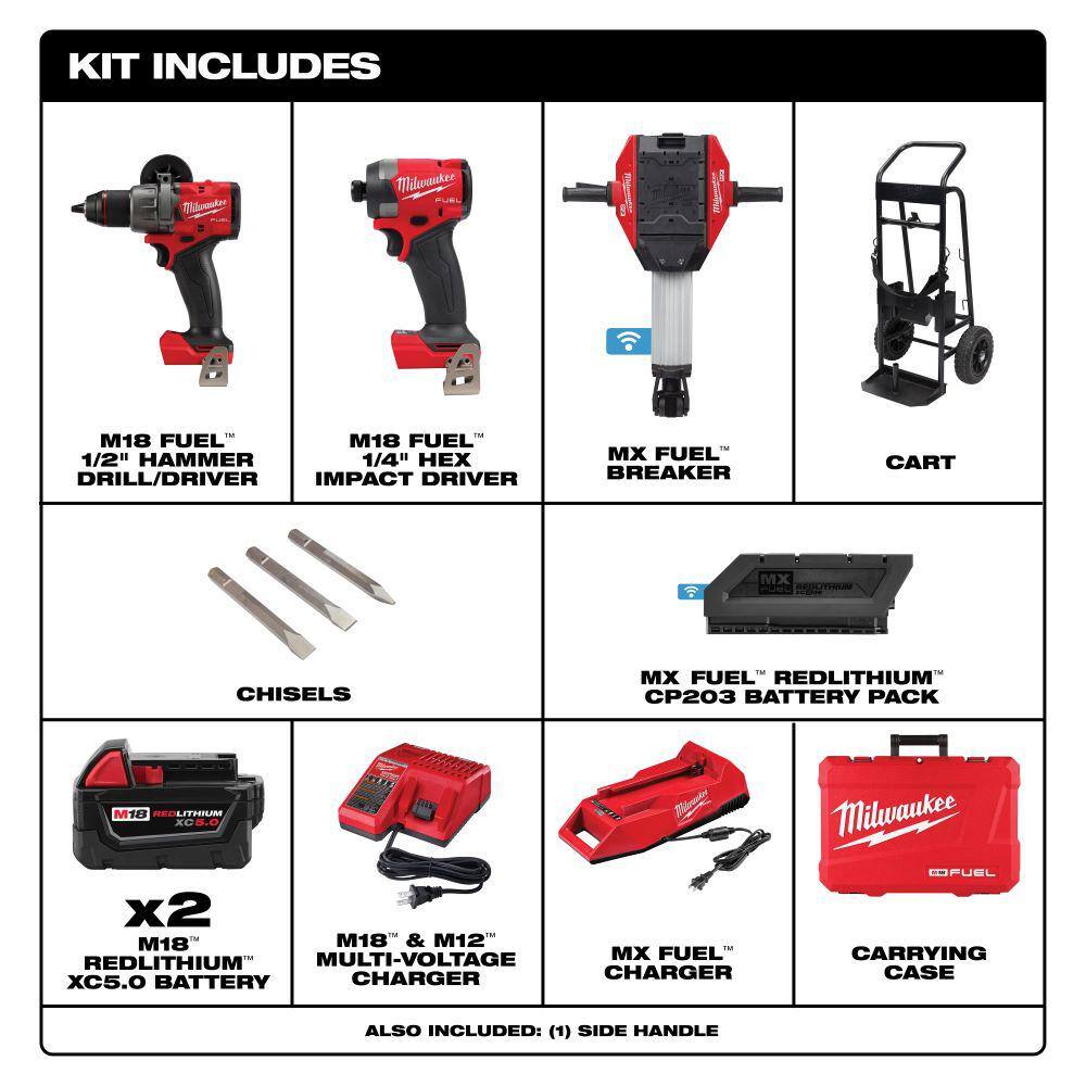 Comprehensive Kit: Includes MX FUEL breaker, XC406 battery, charger, cart, chisels, plus M18 FUEL 1/2" hammer drill and 1/4" hex impact driver with batteries and case