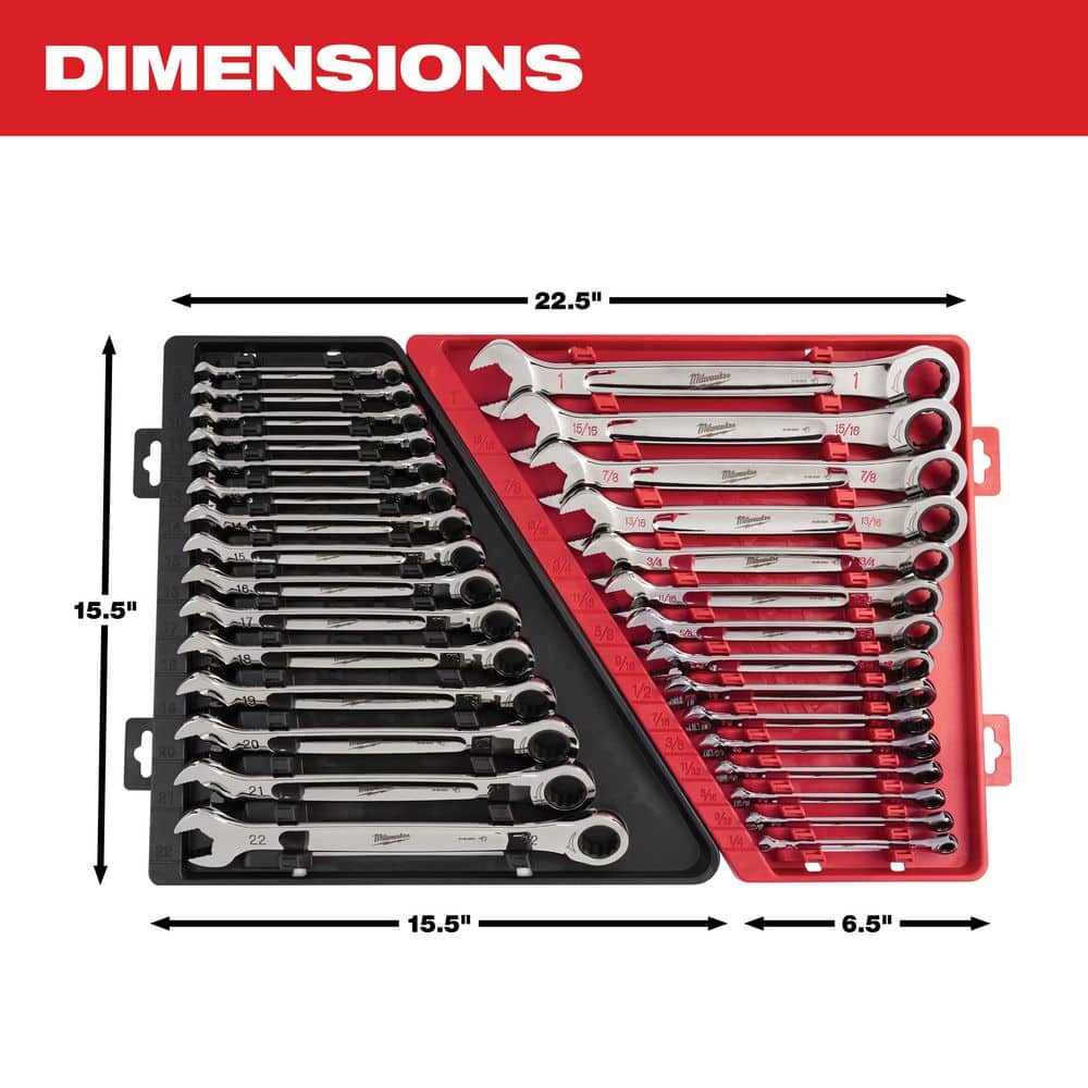 This 15-piece Milwaukee SAE ratcheting combination wrench set delivers tight-space efficiency with 2.5° arc swing and 144 ratcheting positions. MAX BITE open-end grip boosts torque up to 25%, while the PACKOUT 22 in. Tool Box provides durable, IP65-rated storage with metal-reinforced corners.