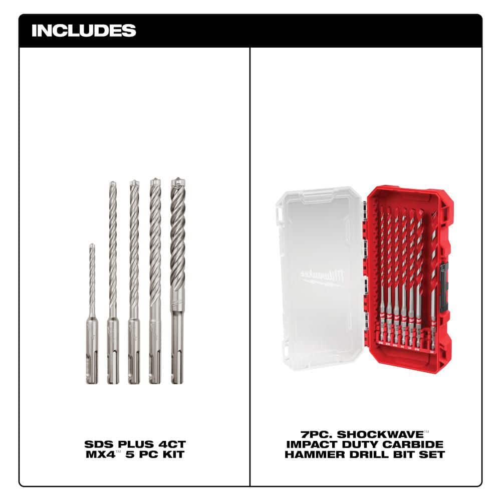 This 12‑piece Milwaukee masonry bit combo pairs SHOCKWAVE Impact Duty carbide hammer drill bits with SDS‑Plus 2/4‑cutter bits for fast, durable drilling in concrete, brick, and block. Precision‑ground carbide tips and wide/variable flute designs speed dust removal, reduce heat, and deliver longer life in tough aggregate and rebar.