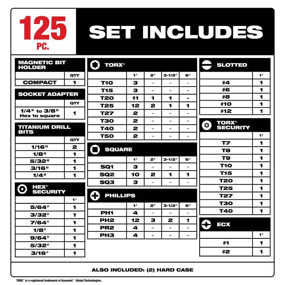 Q: What comes in the case? A: A mix of insert bits, power bits, and a compact magnetic bit holder, organized in a durable, customizable case compatible with PACKOUT.