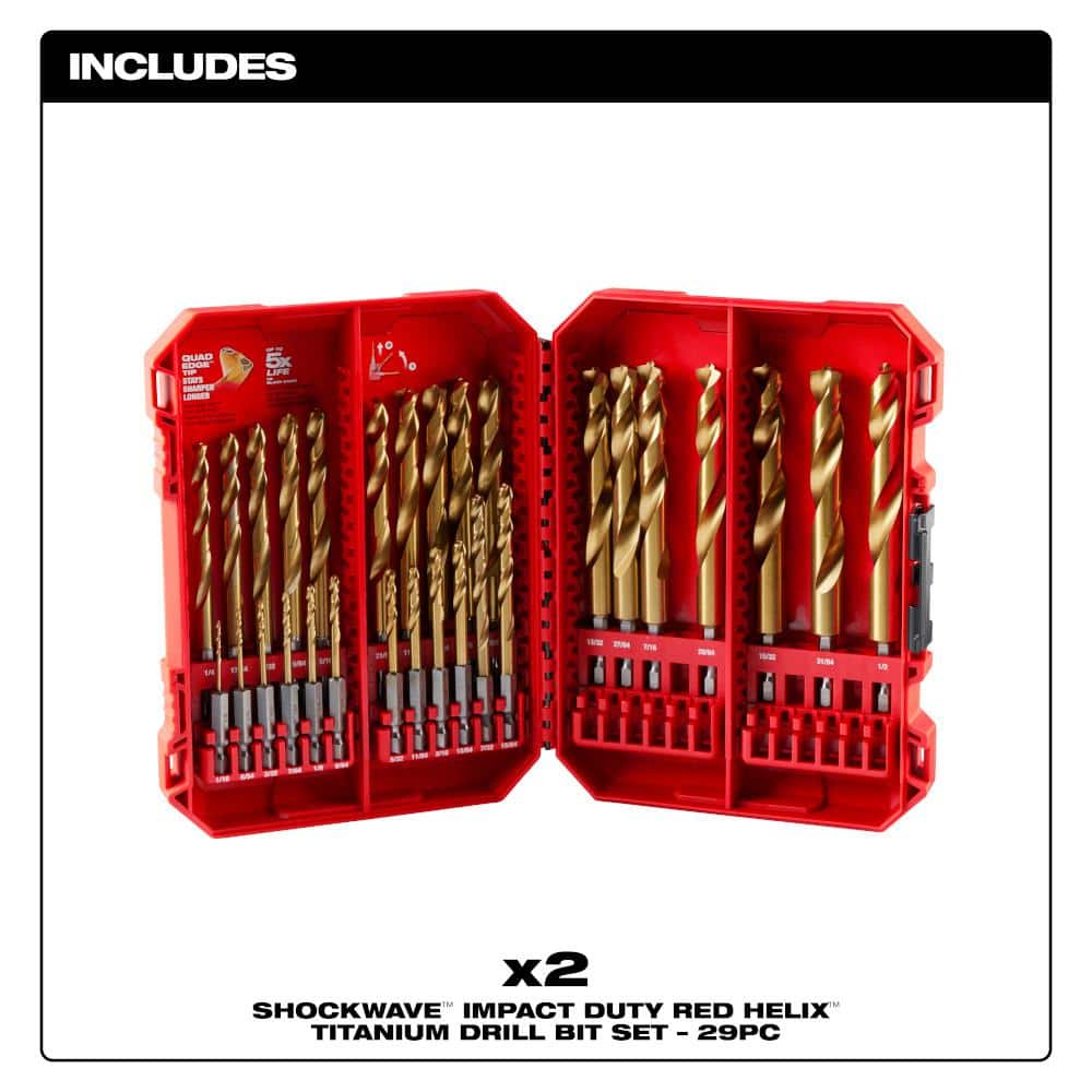 Milwaukee’s SHOCKWAVE Impact-Duty Titanium Drill Bit Set delivers long-lasting performance for drilling in metal, wood, and plastics. RED HELIX technology with a QUAD EDGE tip and VARIABLE HELIX flutes speeds chip removal and resists heat, while the thicker tapered web boosts durability. A 1/4 in. hex shank fits most impact drivers and drills, and the customizable case integrates with PACKOUT for organized storage.