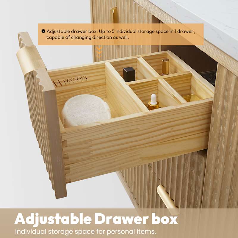 • Ample Storage: 4 doors, 9 soft-close drawers with organizer inserts, and 2 shelves for clutter-free bathrooms