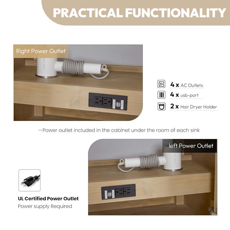 A: Yes. Integrated outlets and USB ports are built into the cabinets under each sink.