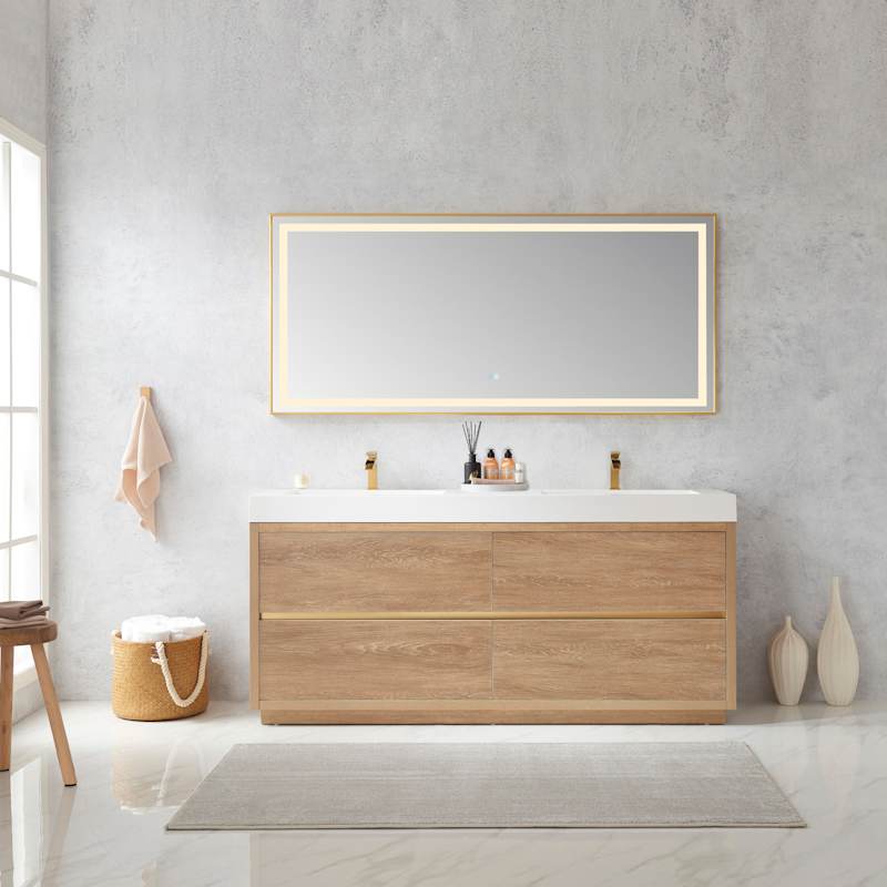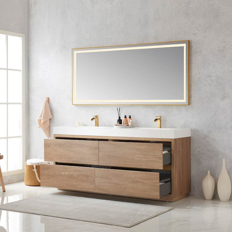 The Huesca vanity invites calm with its North American Oak veneer and tailored, linear profile. A monolithic stone composite top with integrated basins feels exquisitely carved, while the soft-close, full-width drawers create an elegant horizontal rhythm. Style it with brushed brass fixtures and a neutral rug to echo its golden undertones. This piece is a refined anchor for a spa-worthy, modern bath.