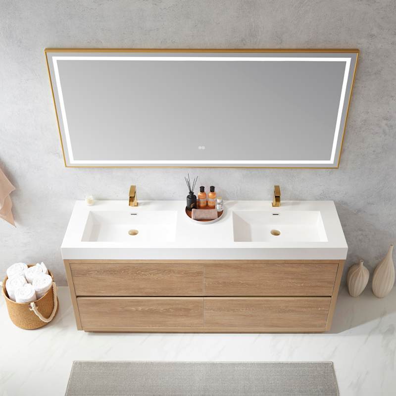 Miseno Huesca 72" Free Standing Double Basin Vanity Set with Wood Cabinet, Stone Composite Top, and 72" x 32" Rectangular Mirror - North American Oak