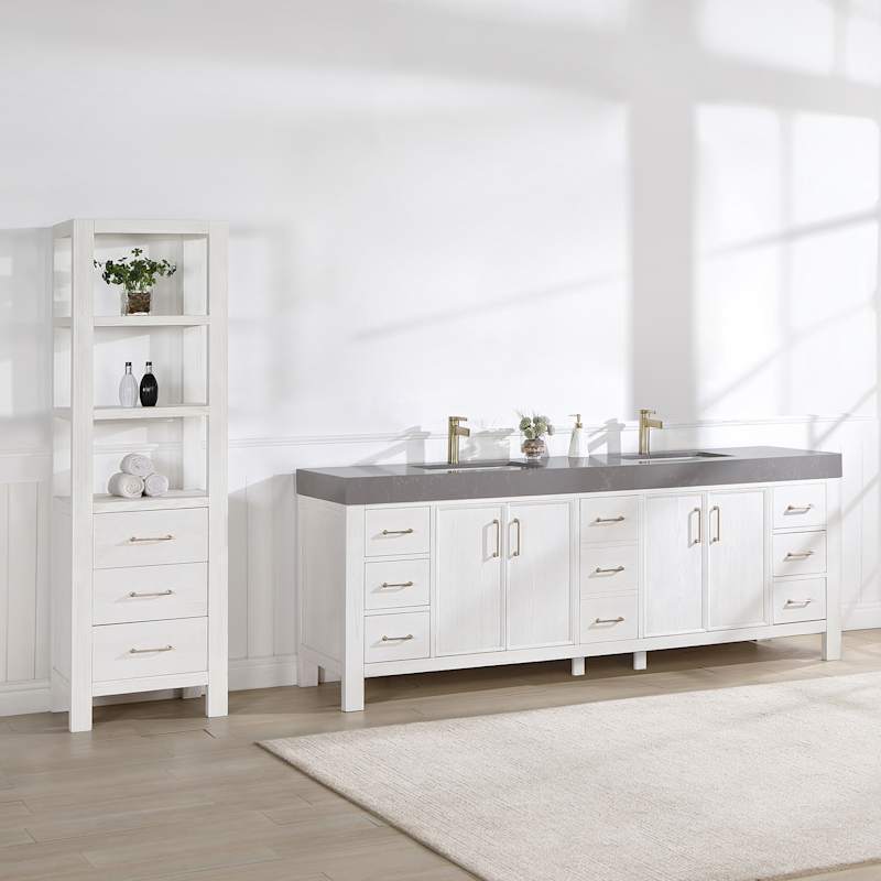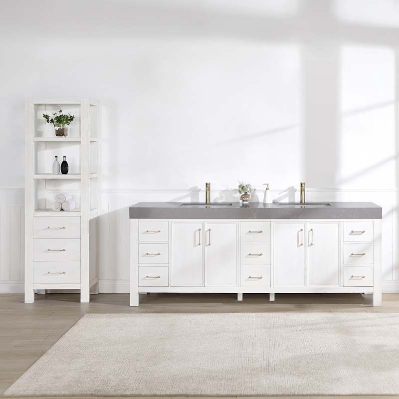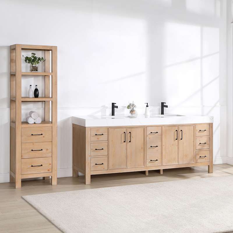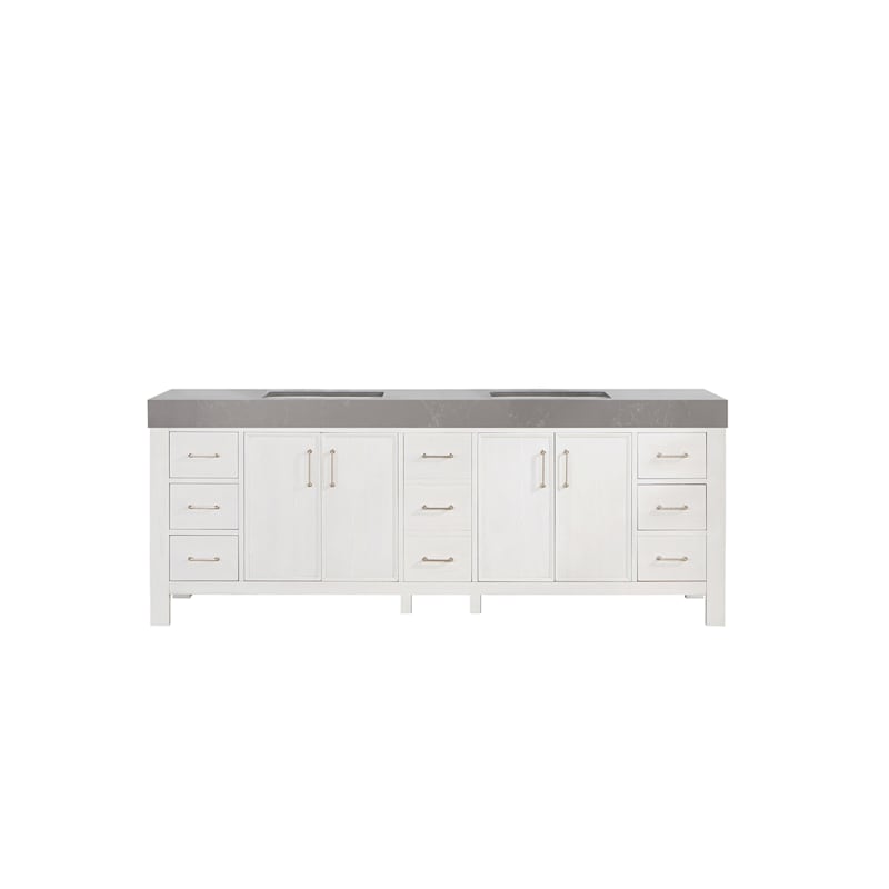 The Miseno León 84-inch double vanity blends solid wood craftsmanship with a thick stone composite countertop for a refined, durable centerpiece. Nine soft-close drawers, four doors, and two shelves keep essentials organized, while two rectangular undermount ceramic sinks arrive pre-installed with single-hole faucet drillings. Built-in power with USB adds modern convenience for daily routines.