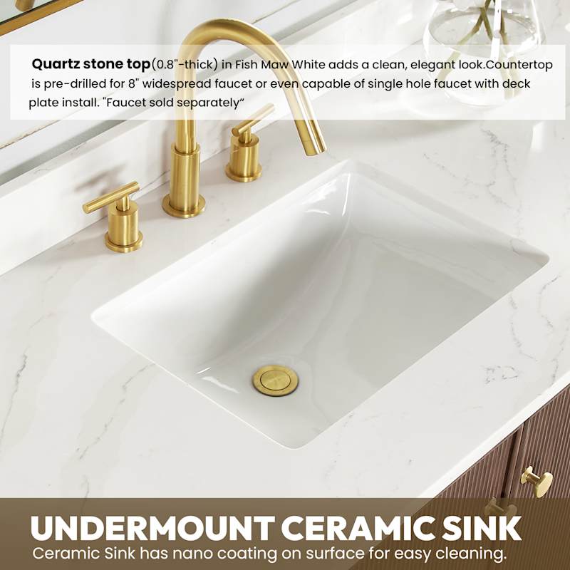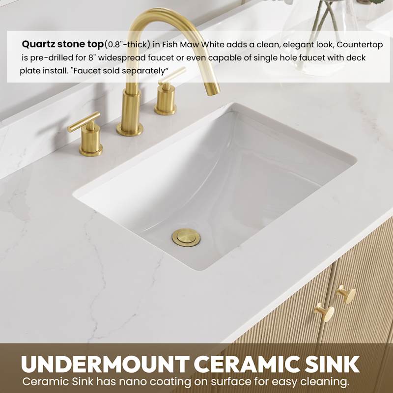 • Premium Quartz Top: 0.8" thick Fish Maw White quartz with included 3.9" backsplash and two rectangular undermount ceramic sinks