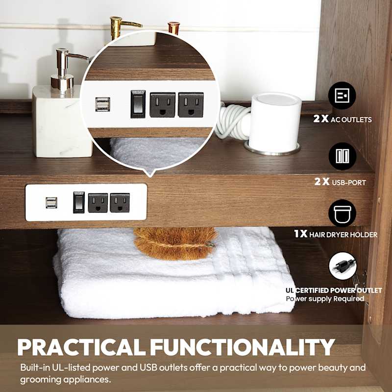 • Convenient Power Hub: Integrated UL-listed electrical outlet and dual USB ports inside cabinet for hair tools and devices