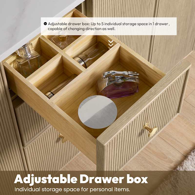 Oza’s ribbed wood facade plays with light and shadow, giving the bathroom a tactile richness that feels bespoke. The slender brass hardware punctuates the warm oak, while the Fish Maw White quartz top brings a cool, tailored counterpoint. Style it with rounded mirrors and soft metallics to echo its gentle curves and refined proportion. This piece is a modern essential—elevating daily rituals with sophistication and ease.