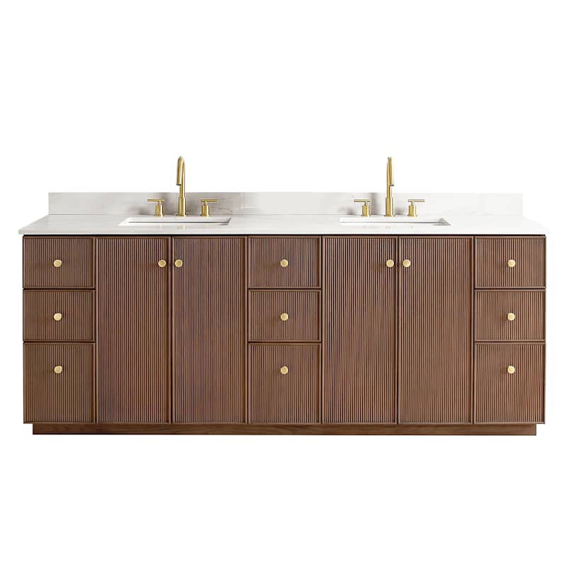 Oza’s fluted wood facade brings a rhythmic texture that instantly elevates the room, paired with a luminous quartz top for crisp contrast. Brass-accent hardware punctuates the silhouette, lending tailored glamour to everyday rituals. Style it with arched mirrors and warm sconces to echo its refined lines and create a serene, hotel-worthy suite. This vanity is a cornerstone of luxurious, effortless living.