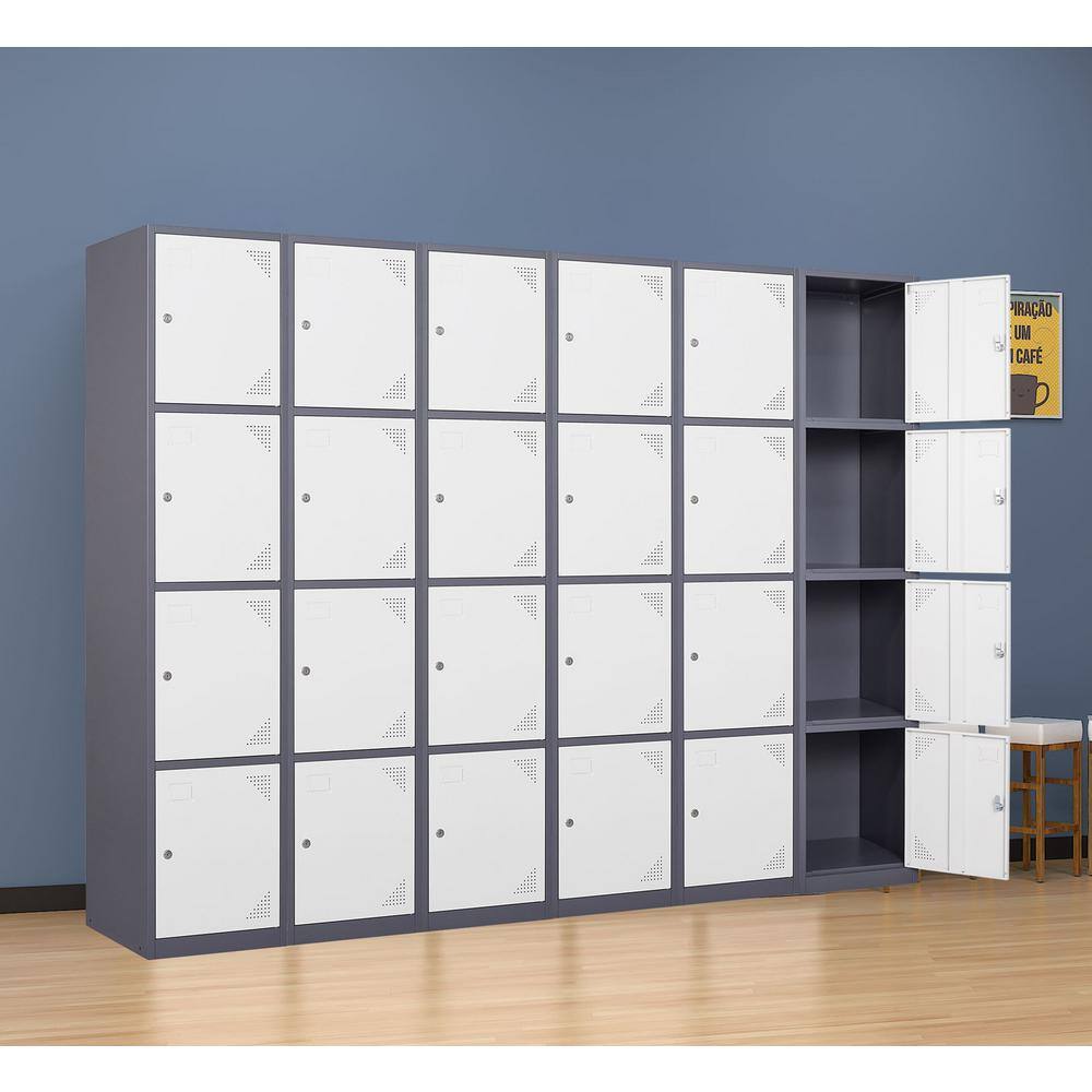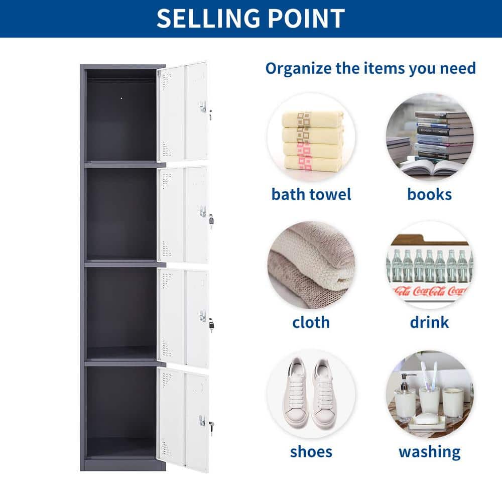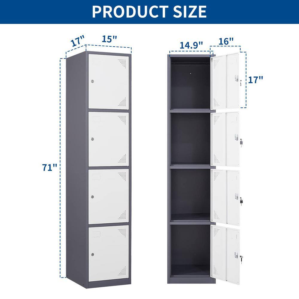 The Mlezan 4-Tier Metal Locker Cabinet offers secure and organized storage for any environment. Designed for versatility, its compact gray and white design seamlessly fits school gyms, offices, or home spaces, providing safety with lockable compartments and ease of assembly.